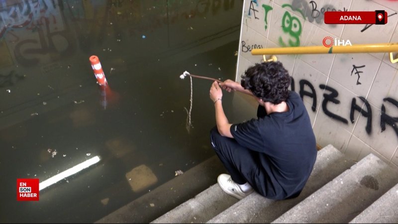 Adana'da 13 gün önce yağan yağmurda göle dönen alt geçidin suyu Adana Büyükşehir Belediyesi tarafından bir türlü çekilmeyince bir vatandaş balık avlayarak tepkisini dile getirdi.