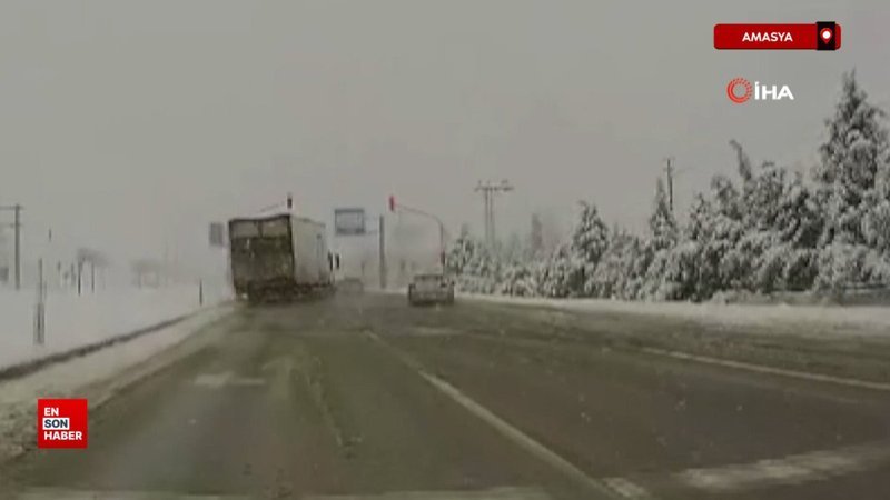 Amasya’da karla kaplı yolda ilerleyen tır sürücüsü, önünde yavaşlayan otomobile çarpmamak için devrilme pahasına yürekleri ağza getiren ani bir manevra yaparak muhtemel bir kazanın önüne geçti. Facianın eşiğinden dönüldüğü o anlar tırın peşinden gelen otomobilin araç kamerasına yansıdı.