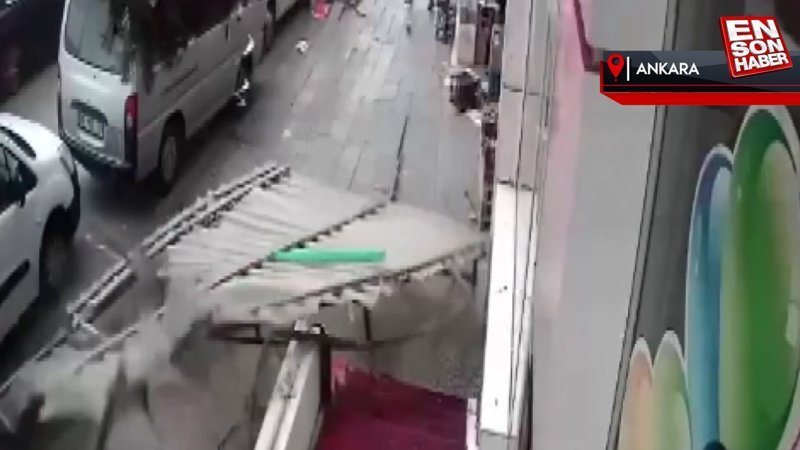 Bir binanın çatısından kopan parçalar kaldırıma düştü. Bu sırada kaldırımdan geçen bir vatandaş ve köpeği, şans eseri yaralanmadan kurtuldu. Bu anlar, bir iş yerinin güvenlik kamerasına yansıdı.