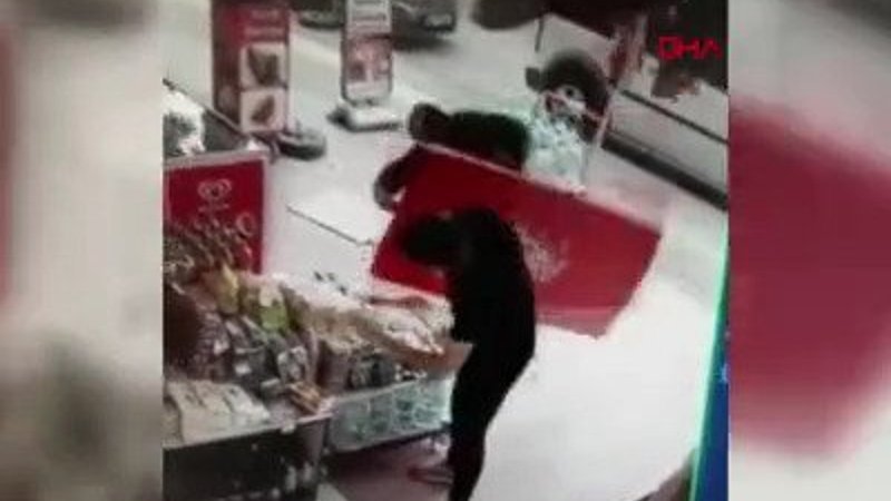 Şiddetli rüzgar nedeniyle yerinden sökülen dondurma dolabının kapakları, çalışanların üzerine savruldu.