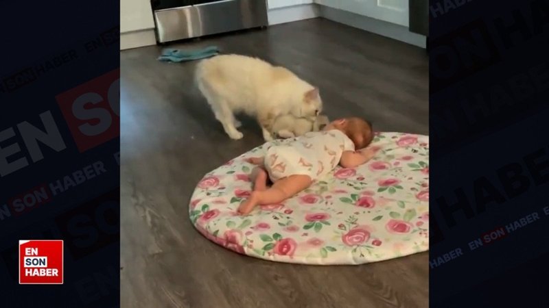 Anne kedi, bebeğini ailenin en yeni üyesine gösteriyor
