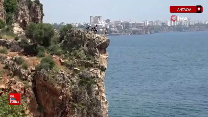Antalya'nın Konyaaltı Sahili'nde adrenalin tutkunu gençlerin 30 metre yüksekliğindeki falezlerden denize yaptıkları tehlikeli atlayış izleyenlerin yüreklerini ağzına getirdi.