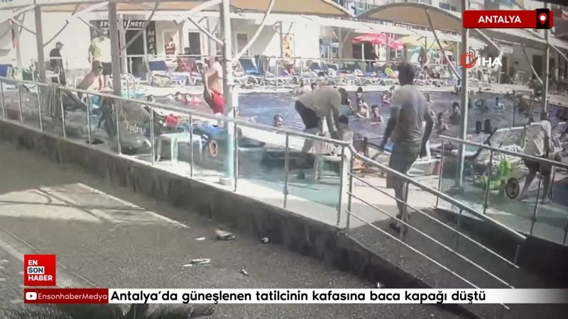 Alanya'da bir otelin havuzunun başında güneşlenen kadın, üzerine baca kapağının düşmesiyle ağır yaralandı. O anlar otelin güvenlik kamerasına yansıdı.