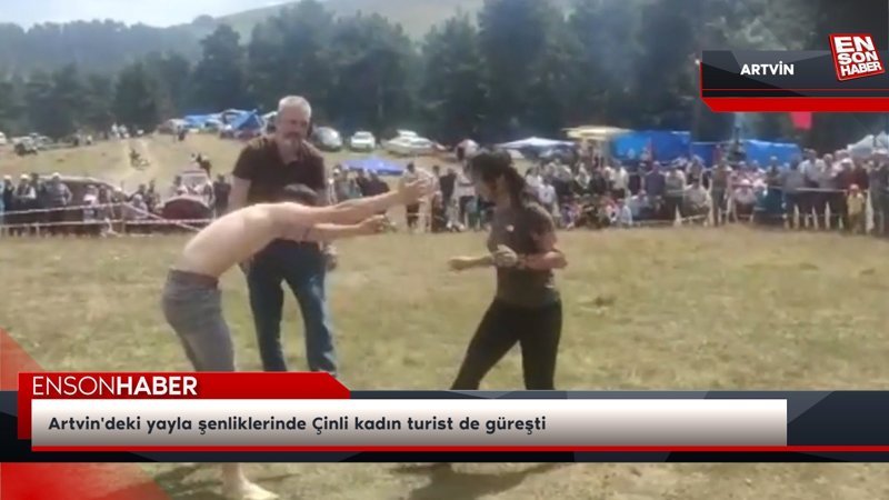Ardanuç ilçesinde düzenlenen yayla şenliklerindeki karakucak güreşlerinde Çinli kadın turistin güreşmesi renkli görüntüler oluşturdu.