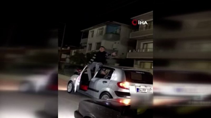 Sakarya’nın Arifiye ilçesinde asker konvoyunda otomobilin sürücü koltuğunu terk ederek tavan kısmına oturan ve çalan müzik eşliğinde oynayan genç "bu kadarına da pes" dedirtti.