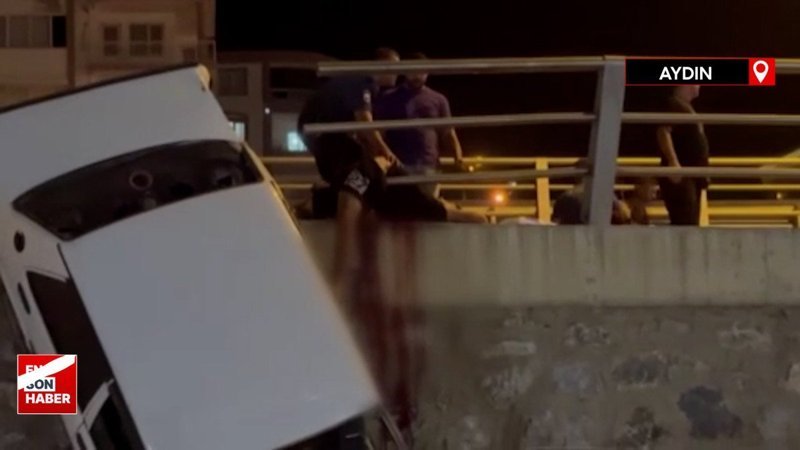 Aydın Kuşadası'nda demir korkuluklara çarpan otomobil uçurumda asılı kaldı. Araçtan fırlayan sürücü vücuduna saplanan demir korkulukla hastaneye kaldırıldı.