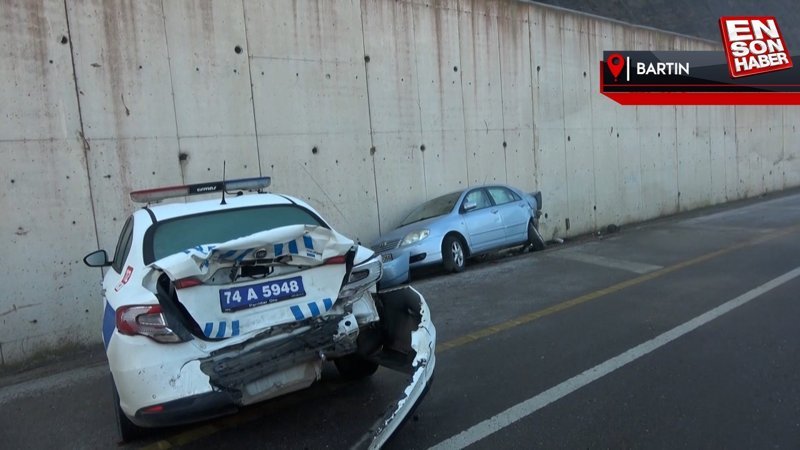 Bartın'da buzlanan yolda kayan otomobil polis aracına çarptı