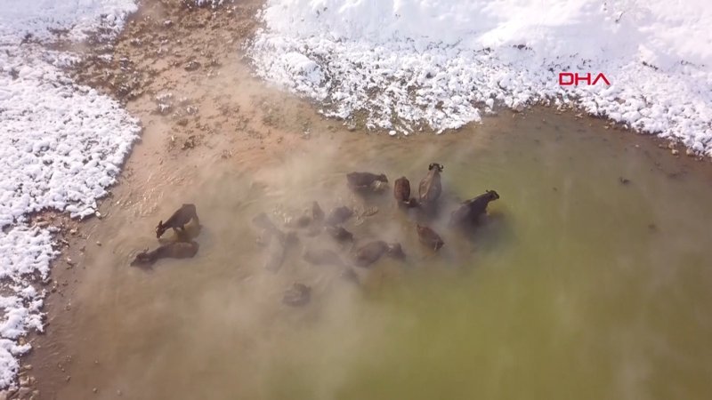Bitlisli yetiştiriciler, eksi 20 derecede mandalarıyla kaplıcada suya giriyor