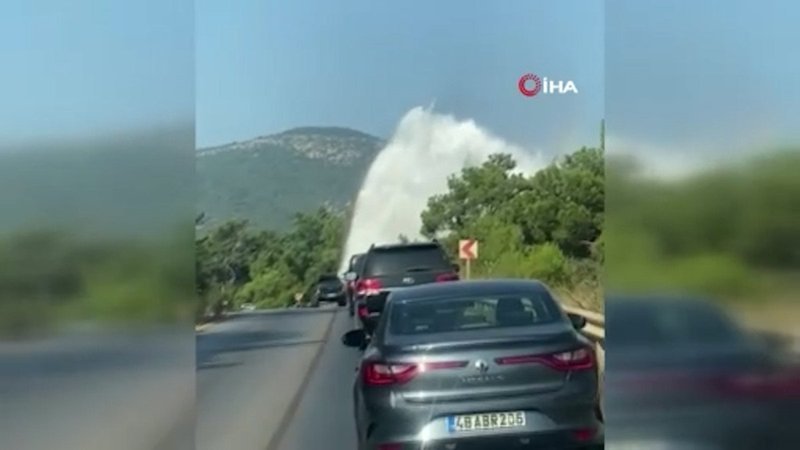 Muğla’nın Bodrum ilçesinde ana isale hattı patladı, tazyikli su metrelerce havaya yükseldi.
