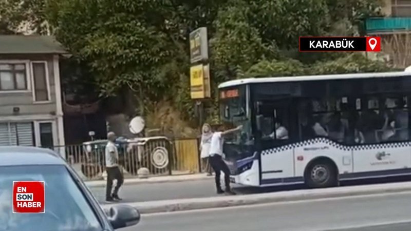 Karabük'te bir kişinin seyir halindeki halk otobüsünün önüne atladığı anlar cep telefonu kamerası ile görüntülendi.