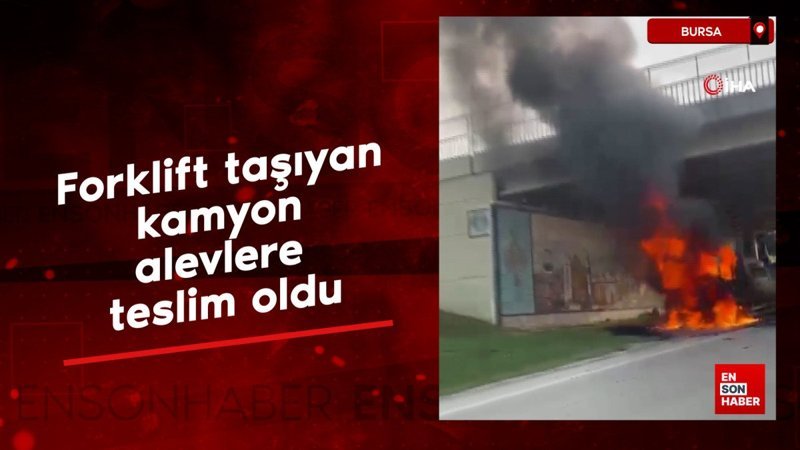 Bursa'da forklift taşıyan kamyon, henüz bilinmeyen bir sebepten dolayı alevlere teslim oldu. Alev alev yanan kamyon, amatör kameraya yansıdı.