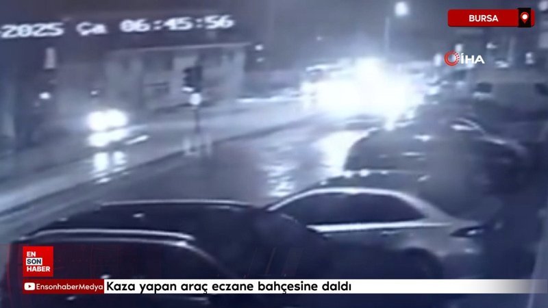 Bursa'da hafif ticari araç ile otomobil kafa kafaya çarpıştı. Çarpışmanın etkisiyle yoldan çıkan hafif ticari araç bir eczanenin bahçesine daldı. O anlar saniye saniye güvenlik kamerasına yansıdı.