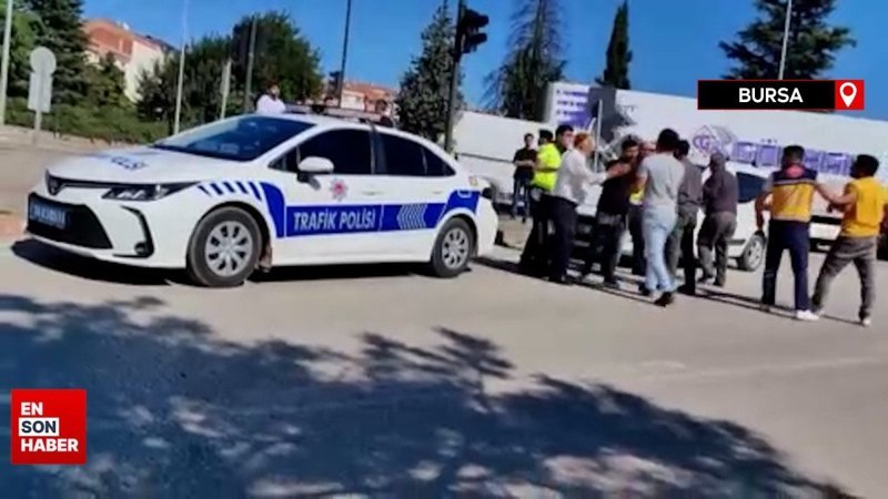 Bursa'da hafif ticari aracın çarptığı kadının yaralandığı kazanın ardından kadının eşi ve çocukları ile çarpan sürücü arasında yaşanan kavga amatör kameraya yansıdı.