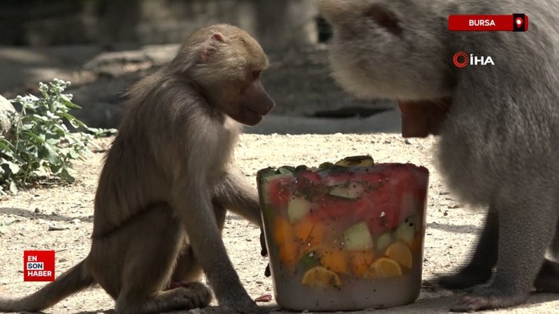 Bursa Büyükşehir Belediyesi Hayvanat Bahçesi'nde hayvanlar, 40 dereceyi bulan sıcaklarda buzlu meyve ve sebzelerle serinliyor.