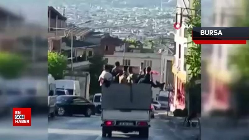 Bursa’da düğünleri olduğu için açık kasa kamyonetin kasasına binip kilometrelere yol giden 8 kişinin tehlikeli yolcuğu amatör kameraya saniye saniye yansıdı.