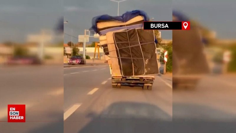 Bursa'da trafiğe çıkan bir kamyonet sürücüsü, yüklediği aşırı yükle hem kendisini hem de diğer sürücüleri tehlikeye attı. Tehlikeli taşımacılık kameralara yansıdı.