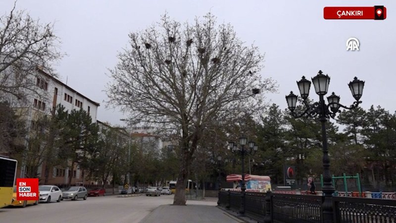 Çankırı'da bir ağaçta yer alan 8 karga yuvası, görenlerin dikkatini çekiyor.