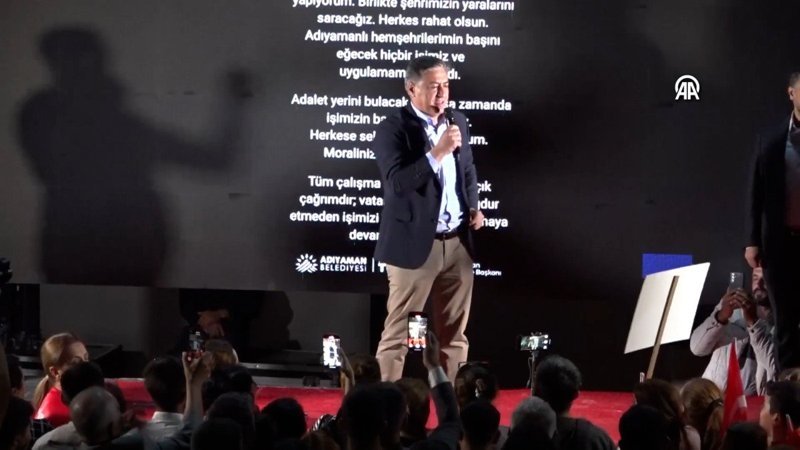CHP Grup Başkanvekili Murat Emir, Adıyaman’da Belediye Başkanı Abdurrahman Tutdere’nin gözaltına alınmasına karşı düzenlenen mitingde konuşmasını tamamladıktan sonra sahneden inerken dengesini kaybederek düştü