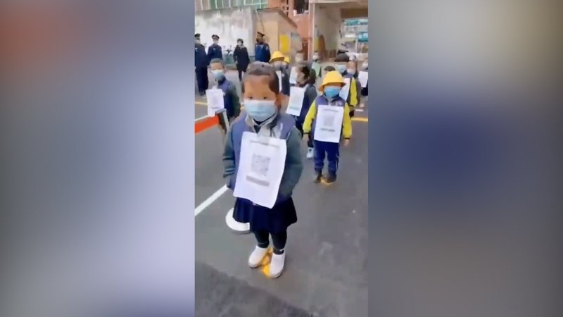 Koronavirüs salgınıyla mücadelenin devam ettiği Çin'de anaokulu çocukları, nükleik asit testi için boyunlarına asılan kodlarla sıraya girdi.