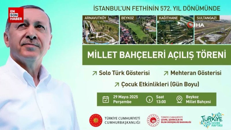 Çevre, Şehircilik ve İklim Değişikliği Bakanlığı, Cumhurbaşkanı Recep Tayyip Erdoğan'ın 29 Mayıs'ta Beykoz Millet Bahçesi'nde "İstanbul'un fethinin 572. yılı kutlamaları ve millet bahçeleri açılış töreni"ne katılacağını bildirdi.