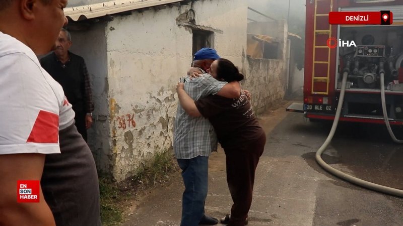 Denizli'de müstakil evin bahçesinde başlayan yangın evi küle çevirdi. Ailesinin evinin yandığı haberini alır almaz olay yerine gelen bir kadının babasını evin dışında görünce yaşadığı sevinç ise dikkatlerden kaçmadı.