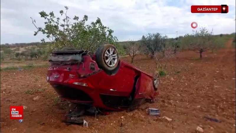 Gaziantep'te lastiği patlayan otomobil fıstık bahçesine uçtu
