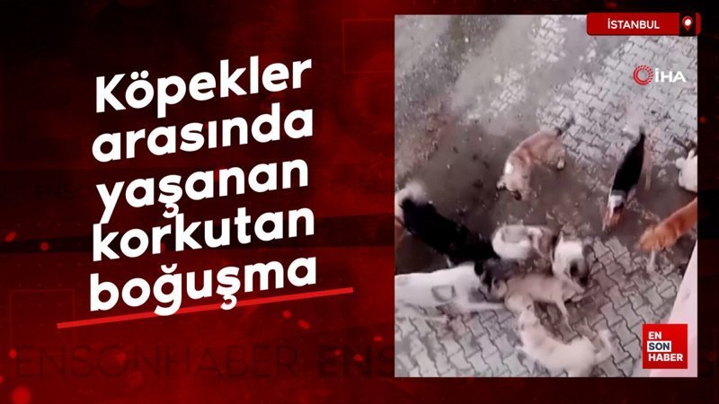 Hatay'ın Yayladağı ilçesinde 7 köpeğin, 2 köpeğe parçalarcasına saldırdığı korkutan boğuşma anları cep telefonu kamerasına yansıdı.
