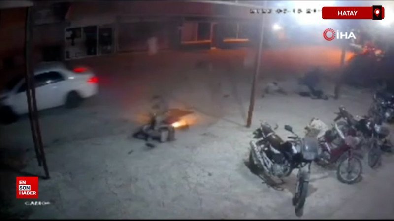 Hatay’da bir otomobilin, 2 motosikletle çarpışmasıyla 4 kişinin yere savrulduğu anlar güvenlik kamerasına yansıdı.