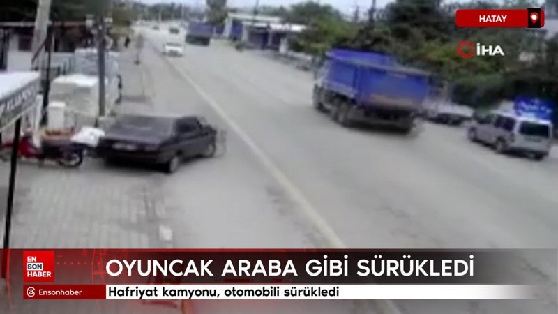 Hatay’da hafriyat kamyonunun kör noktasına gelen Tofaş marka aracın sürüklendiği anlar kameraya yansıdı. Yaralanmanın olmadığı kazada kamyonun, otomobili oyuncak araba gibi önüne aldığı görüldü.