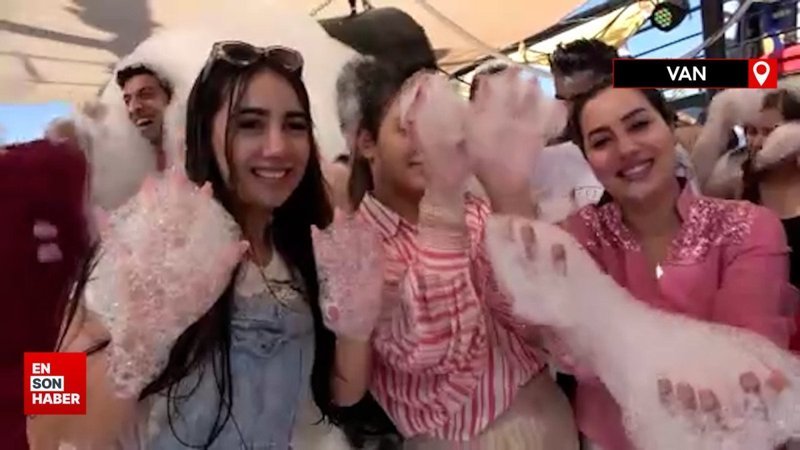 Kente tatile gelen İranlı turistler, gemi ile açıldıkları Van Gölü'nde bir yandan yüzmenin keyfini yaşıyor diğer yandan ise köpük partisinde keyifli vakit geçiriyor.
