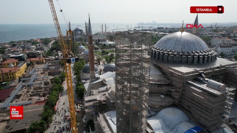 Ayasofya-i Kebir Camii Şerifi ana kubbesinde, tarihinin en kapsamlı güçlendirme ve restorasyon çalışması sürüyor. Ana kubbe, yarım kubbeler, minare ve dış yüzeydeki restorasyon çalışmaları havadan görüntülendi.