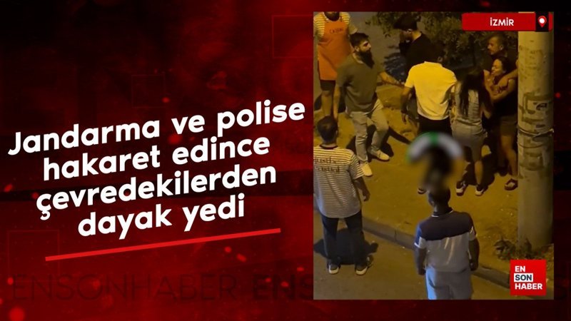 İzmir’de bir şahıs, eşinin yanında bir kişiye saldırıp jandarma ve polise hakaret edince çevredekilerden meydan dayağı yedi.