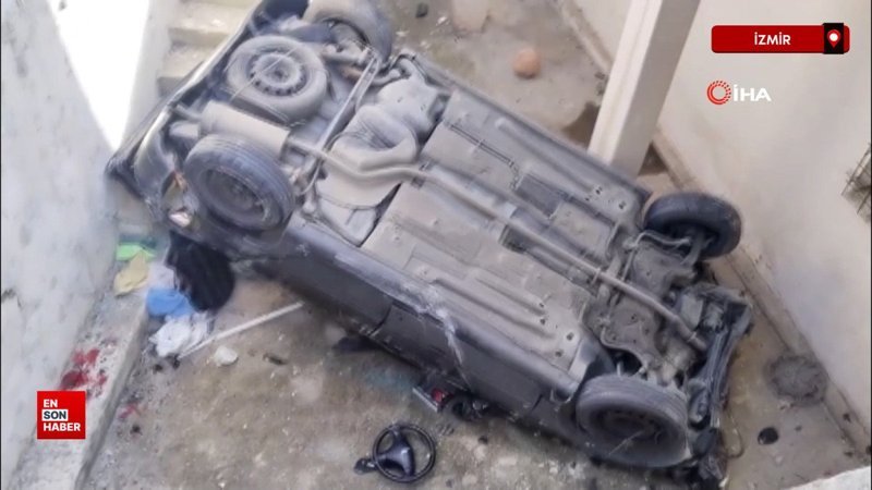 İzmir'de virajı alamayan otomobil, apartman boşluğuna uçtu
