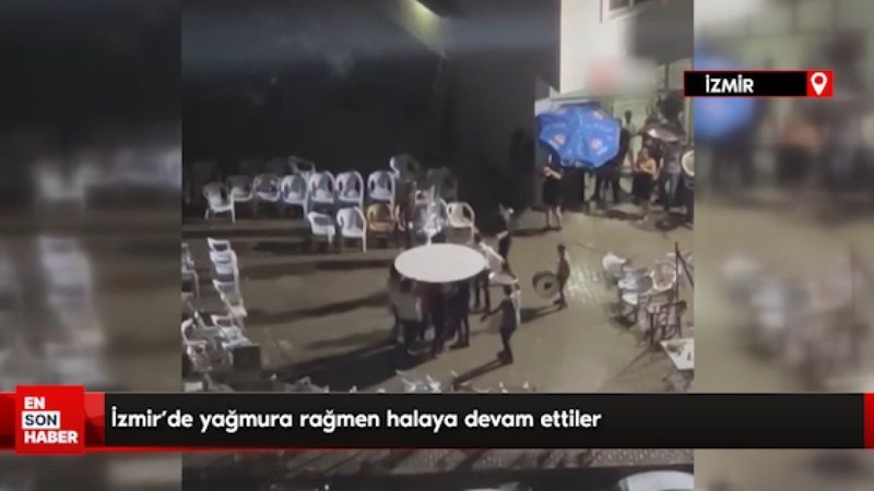 İzmir’de düğündeki bir grup, şiddetli yağmura rağmen masanın altında halay çekmeye devam etti. O anlar cep telefonu kamerası ile kaydedildi.