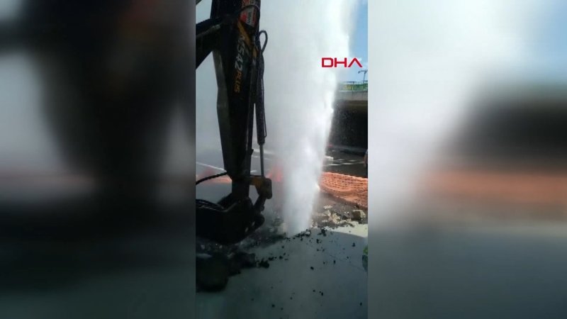 Kadıköy'de sokakta kazı çalışmaları sırasında iş makinesi su borusunu patlattı, su metrelerce yukarıya fışkırdı.