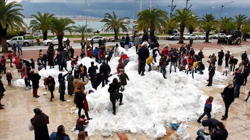Antalya'nın Alanya ilçesinde çocuklar, belediye ekiplerince yüksek kesimlerden toplanıp ilçe merkezine taşınan karla, kışın keyfini yaşadı.