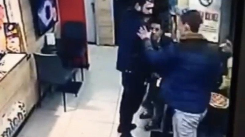 Kasımpaşa’da sokağa çıkma kısıtlamasında pizzacıya gelen bir şahıs, içeride masada oturarak yemek yiyen çalışanları uyarınca tekme ve yumruklarla darp edildi. Peçete kutusunun havada uçuştuğu kavga anları ise güvenlik kameralarına yansıdı.