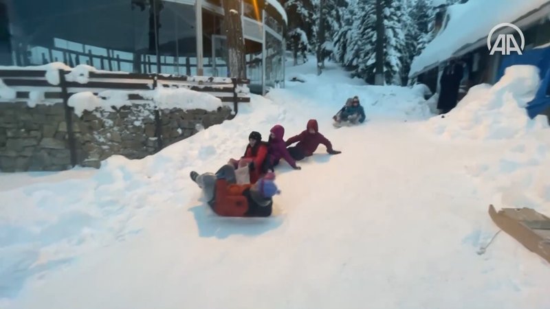 Azdavay ilçesinde bir kafe sahibi, iş yerinin yanında bulunan yokuşu çocuklar için mini kayak pistine dönüştürdü.