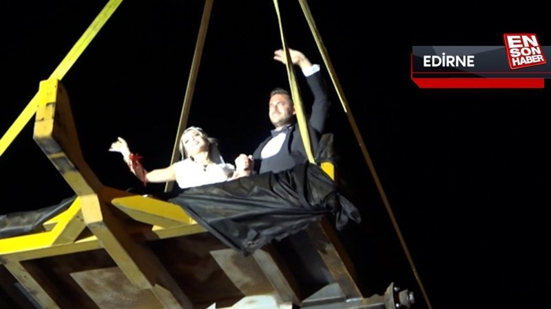 Düğünlerde gelin ve damadın tören anlanına girirken bulduğu ilginç yöntemlere bir yenisi daha eklendi. Edirne'deki törende evlenecek çift törene vinçle geldi.