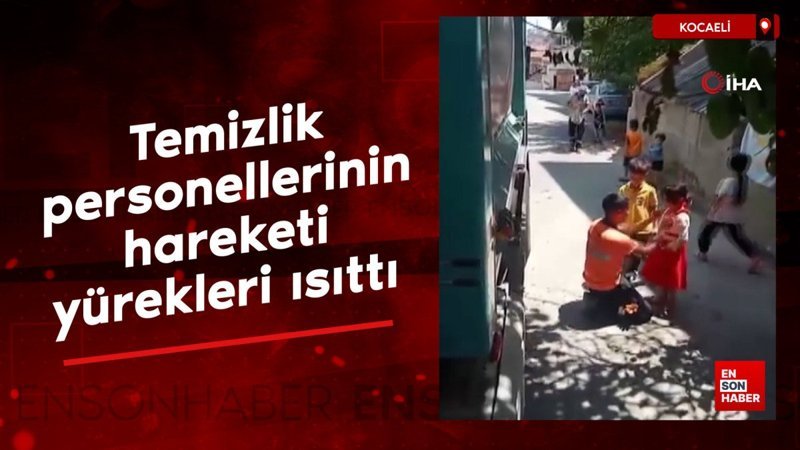 Kocaeli'nin Gebze ilçesinde temizlik işleri personeli, çöpleri toplamak için gittikleri mahallede çocuklarla kucaklaşarak onlara çikolata verdi. İçleri ısıtan o görüntüler, cep telefonu kamerasına yansıdı.