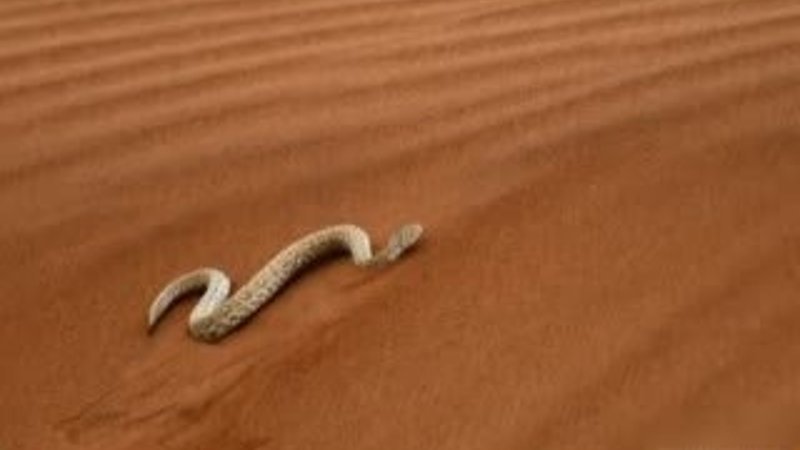 Kızgın çöl kumunun üzerinde adeta dans eden yılan, kertenkeleyi görünce şimşek hızıyla yerinden fırlayıp avını yakaladı ve hedefine ulaştı.