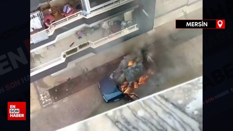 Mersin'de alev alan otomobile, balkonda kova ile su dökerek müdahale etmeye çalıştı. O anlar kameraya yansırken, yangın itfaiye ekiplerince söndürüldü.