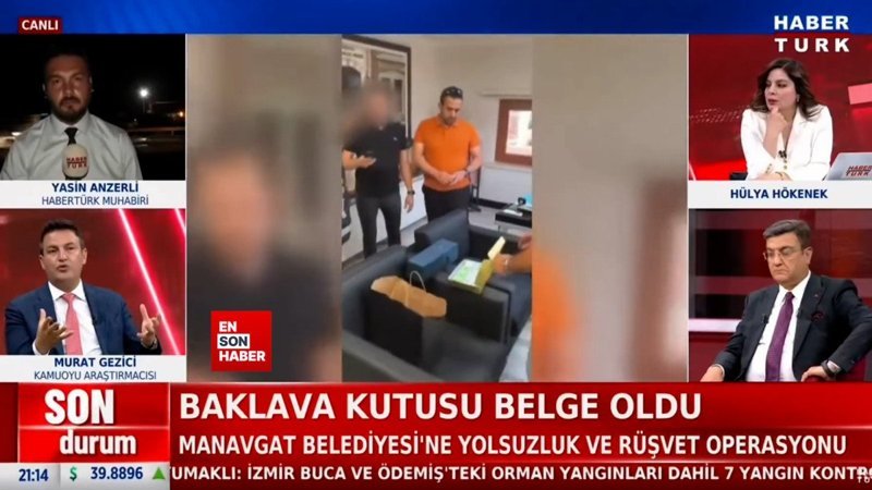 Kamuoyu araştırmacısı Murat Gezici, Antalya Manavgat Belediyesi'nde yapılan aramada baklava kutusundan çıkan rüşvet paraları için bölgeden durumu anlatan muhabire "bağış" olabileceğine yönelik sorular sordu.