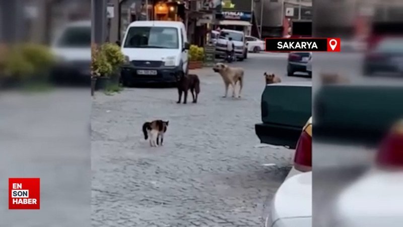 Sakarya'da cesur kedi boyundan büyük 3 köpeğe kafa tutup sokaktan geçirmedi