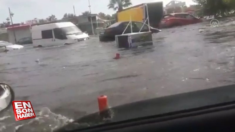 İzmir'in Seferihisar ilçesi açıklarında cuma günü meydana gelen depremin ardından ilçedeki su taşkını sırasında 62 yaşındaki Ayhan Köksal arabasında mahsur kaldığı anları cep telefonu ile görüntüledi.
