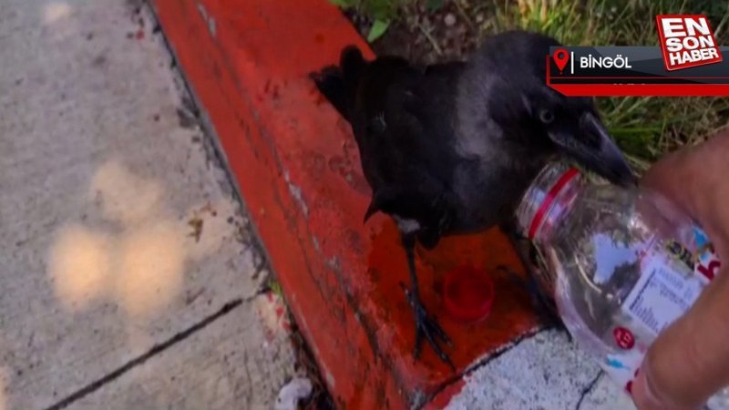 Bingöl’de duyarlı bir vatandaş, aşırı sıcaklardan dolayı bunalan kargaya su içirdi. O anları cep telefonu kamerasıyla kaydetti.