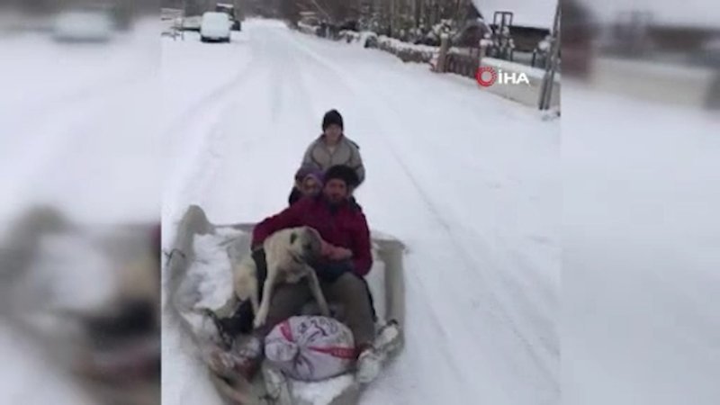 Kanepeden yaptıkları düzeneği traktörün arkasına bağlayıp kayan bir grup vatandaş köpekleri de yanlarına alınca renkli görüntüler oluştu.