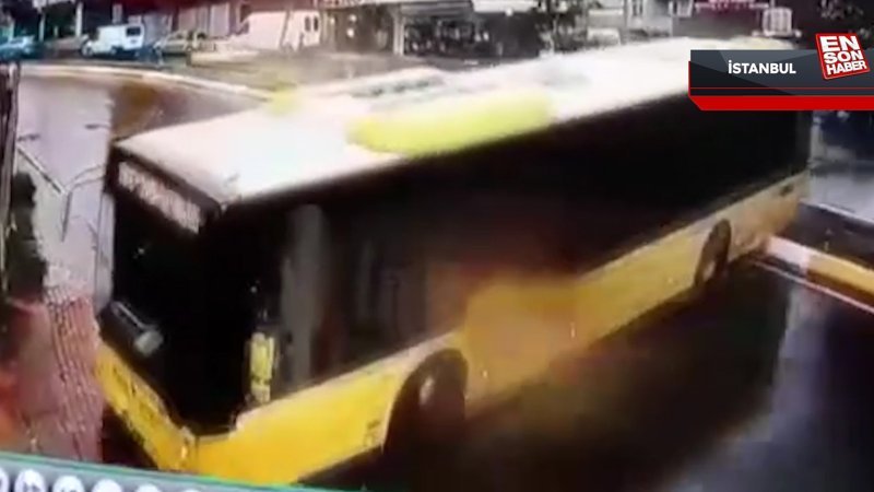 Yağış nedeniyle kayganlaşan yolda kontrolü kaybeden otobüs şoförü, yolda ters dönerek kaldırıma çıktı. Korku dolu anlar ise anbean kameraya yansıdı.
