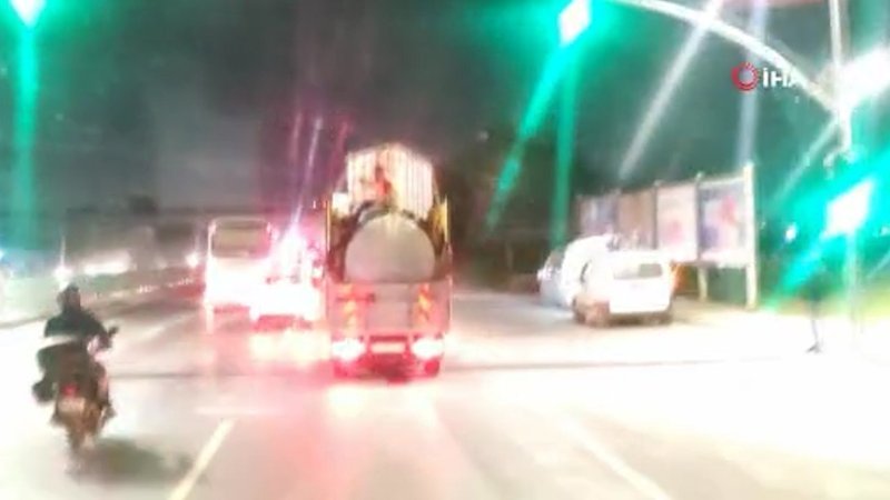 Sultangazi'de, su tankı taşıyan açık kasa kamyonetin üzerinde seyahat eden bir kişinin tehlikeli yolculuğu cep telefonu kamerasına yansıdı.