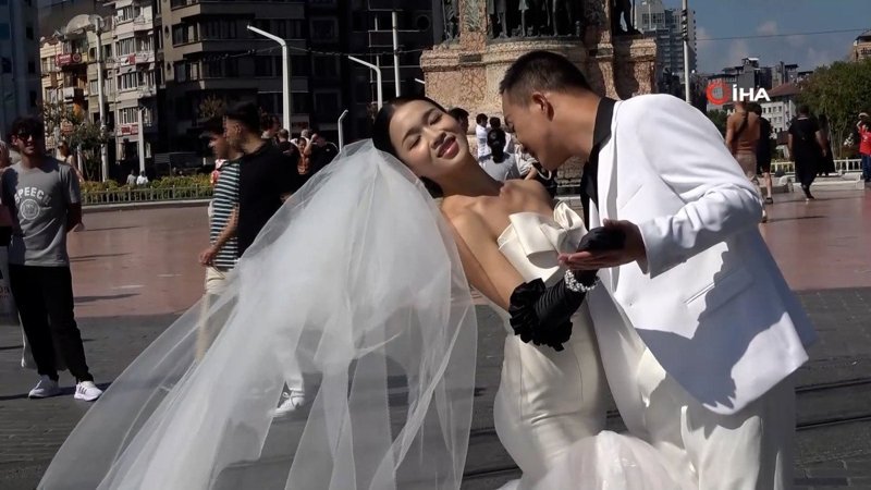 Taksim Meydanı’na düğün fotoğrafı çektirmek için gelen Çinli çift, meydanda bulunan vatandaşların yoğun ilgisiyle karşılaştı. Taksim Meydanı, bu sene de İstanbul’da evlenen yabancı çiftlerin düğün çekimleri için uğrak noktası oldu.
